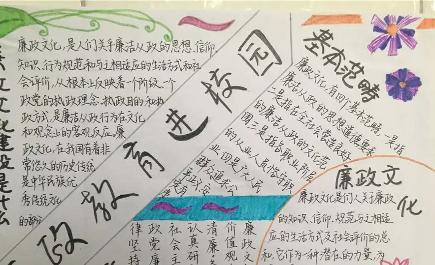 为学生敬廉崇洁教育奠定基础,培养学生良好的思想品德和崇高理想,学院大一同学开展了廉政文化进校园手抄报活动,并把廉政文化进校园作为德育教育工作主导方向和教育目标。学生通过读书看报、看电视、上网浏览、查找文献等,收集了大量的数据资料,并通过整理汇编,精心设计版面,配上赏心悦目的彩图,在制作和展览活动中自学感悟廉政教育思想。