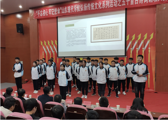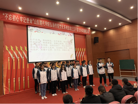 为弘扬中华优秀传统文化,引领学生与圣贤为友,与经典同行,增强青年学生的人文素养和责任意识。11月25日晚,我院于科研楼101举办“不忘初心、牢记使命”弘扬传统文化系列活动之五十首古诗词诵唱大赛。