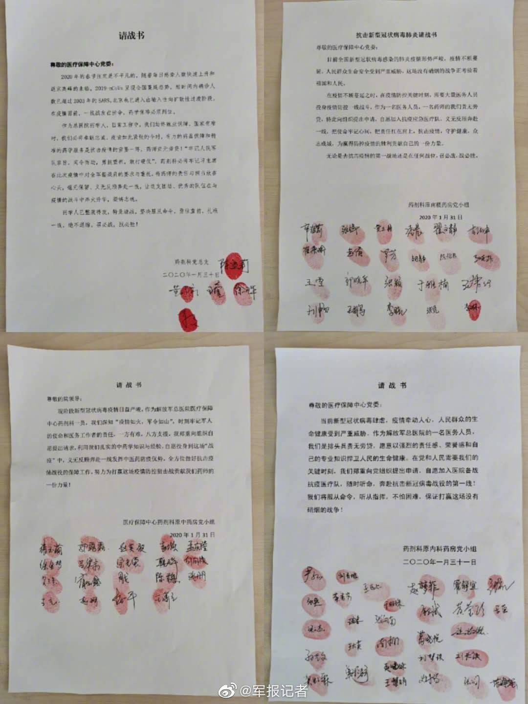 无数医护人员主动请缨,一张又一张的“请战书”上是无数鲜红的手印。“若有战,召必回”是你们最响亮的口号。无论身在何处,都有着共同的信念,放弃与家人团聚的日子,不畏艰险,毅然赶往湖北武汉。不惜用生命守护我们的健康。难道你们就不害怕吗?我想,不是的。很多女护士都剪掉了自己的长发,穿着成人尿不湿和密不透风的防护服走进隔离区,她们戴的护目镜和口罩在白皙的脸上留下深深的痕迹,双手被汗水浸泡出白色的褶皱,但依旧争分夺秒地奋斗在疫区,让人们热泪盈眶,心痛不已。
