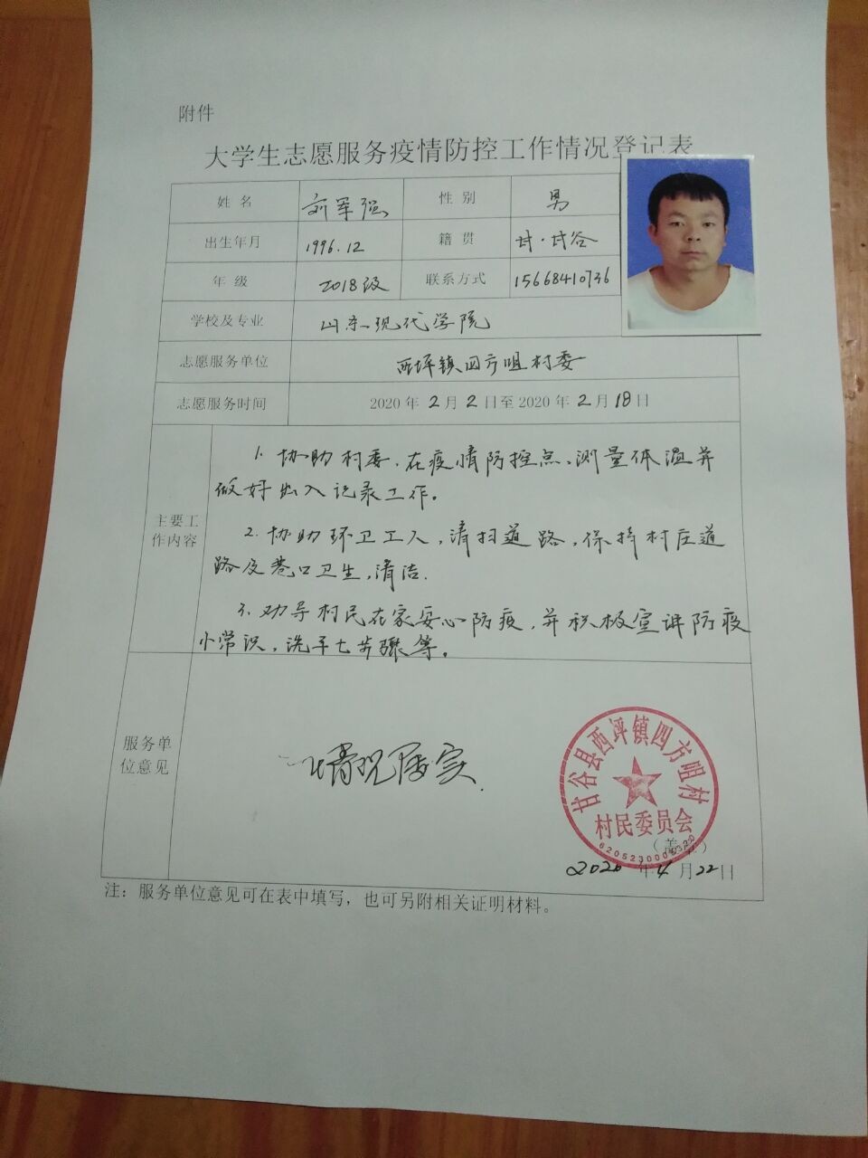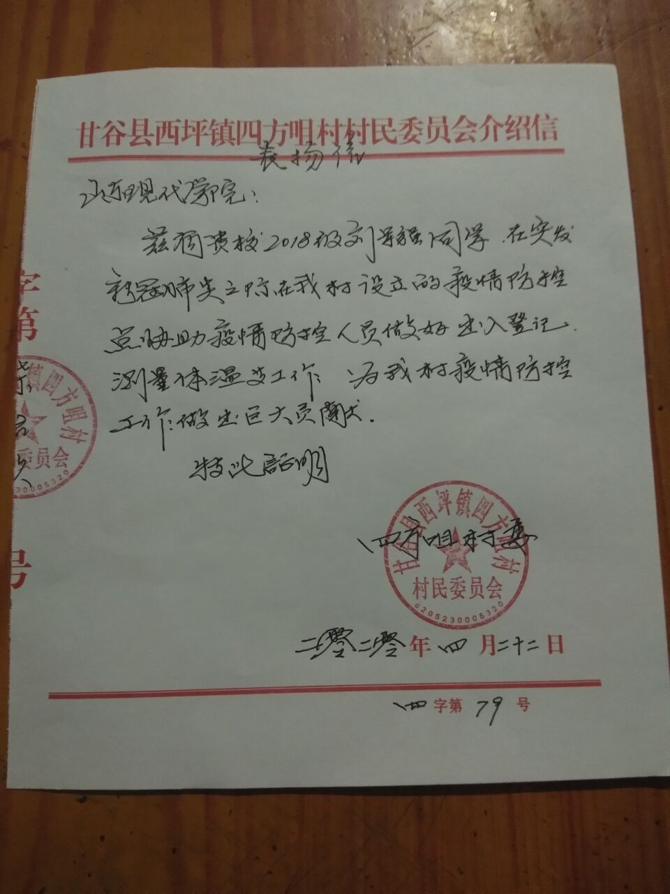 我叫刘军强,就读于山东现代学院,放假回家后,作为一名在家配合国家防疫大局的大学生,我始终关心此次疫情带来的各种影响,时刻关注终南山院士的动态,武汉的各种事务,随着事态的后续发展,我感觉得我们这代青年人应该有所作为,应该为全国防疫做出自己的贡献。因此,我在我的家乡甘肃省的一个偏僻乡下,西平镇四方咀村委,开始了我的“防疫战斗”。