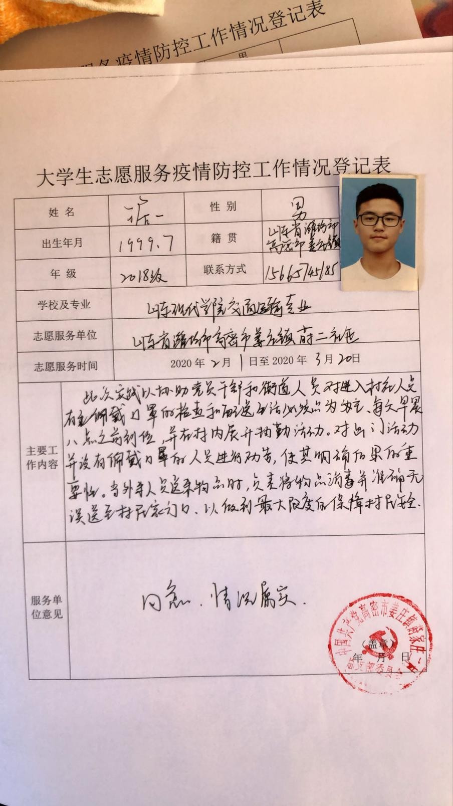 我是一名山东现代学院2018级工学院本科交通运输班的学生,作为一名新时代的大学生,勇做战役中的守护者既是责任也是义务。新冠肺炎疫情暴发以来,我所在的姜庄镇莳二村实行了严格的防控措施,建立“网格化+村民联防邻里守望”疫情防控机制,切实加强了疫情防控网格化管理,在各个进村口设立检查点,而我在主要的村口负责协助对往返人员的体温测量及车辆进出登记工作。我作为一名志愿者,有责任和义务,在家乡疫情防控中做一些力所能及的事。
