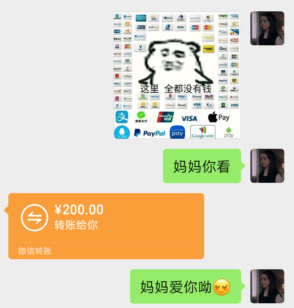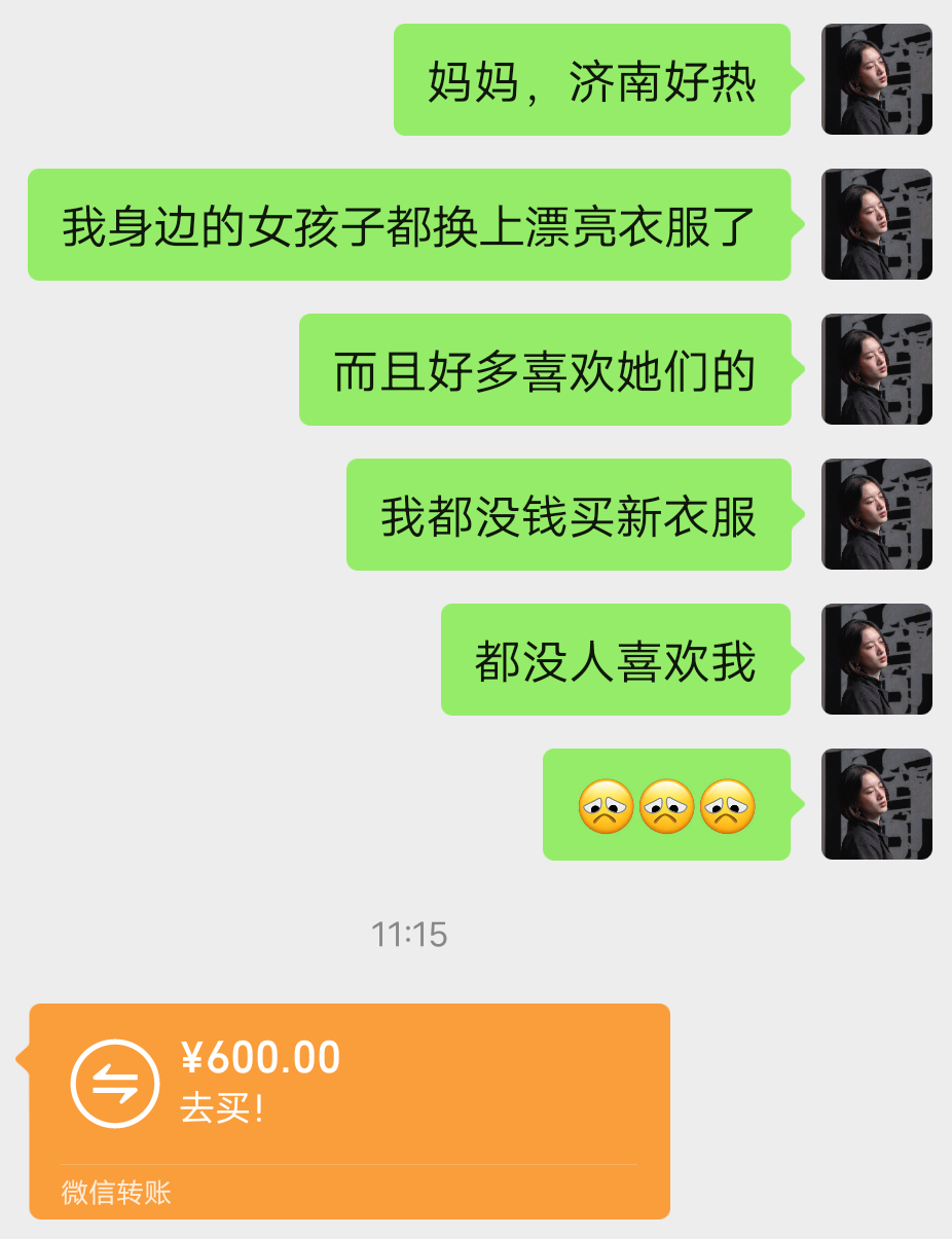话里话外都是因为自己没钱所以没人喜欢,通常这种方式对女生来说非常有效,“我的女儿怎么能没钱买衣服呢,不能让自己的孩子比生活的别人差”,父母的每一次转账都是对自己孩子满满的爱啊!
