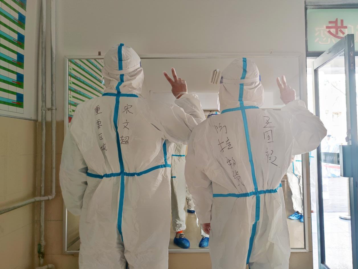 演练开始前,志愿者们去物资处领取了防护服,并按培训时所讲的严格的防疫要求更换了防护服,为方便区分,大家互相为对方写下了队名与姓名,按分队集合。