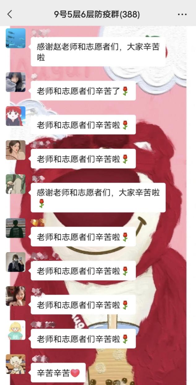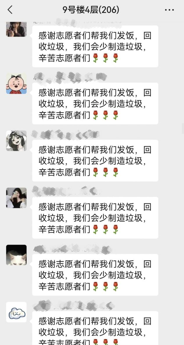 志愿者们身穿隔离服为每个寝室派送物资,一大早便为我们送来了暖心的早餐。