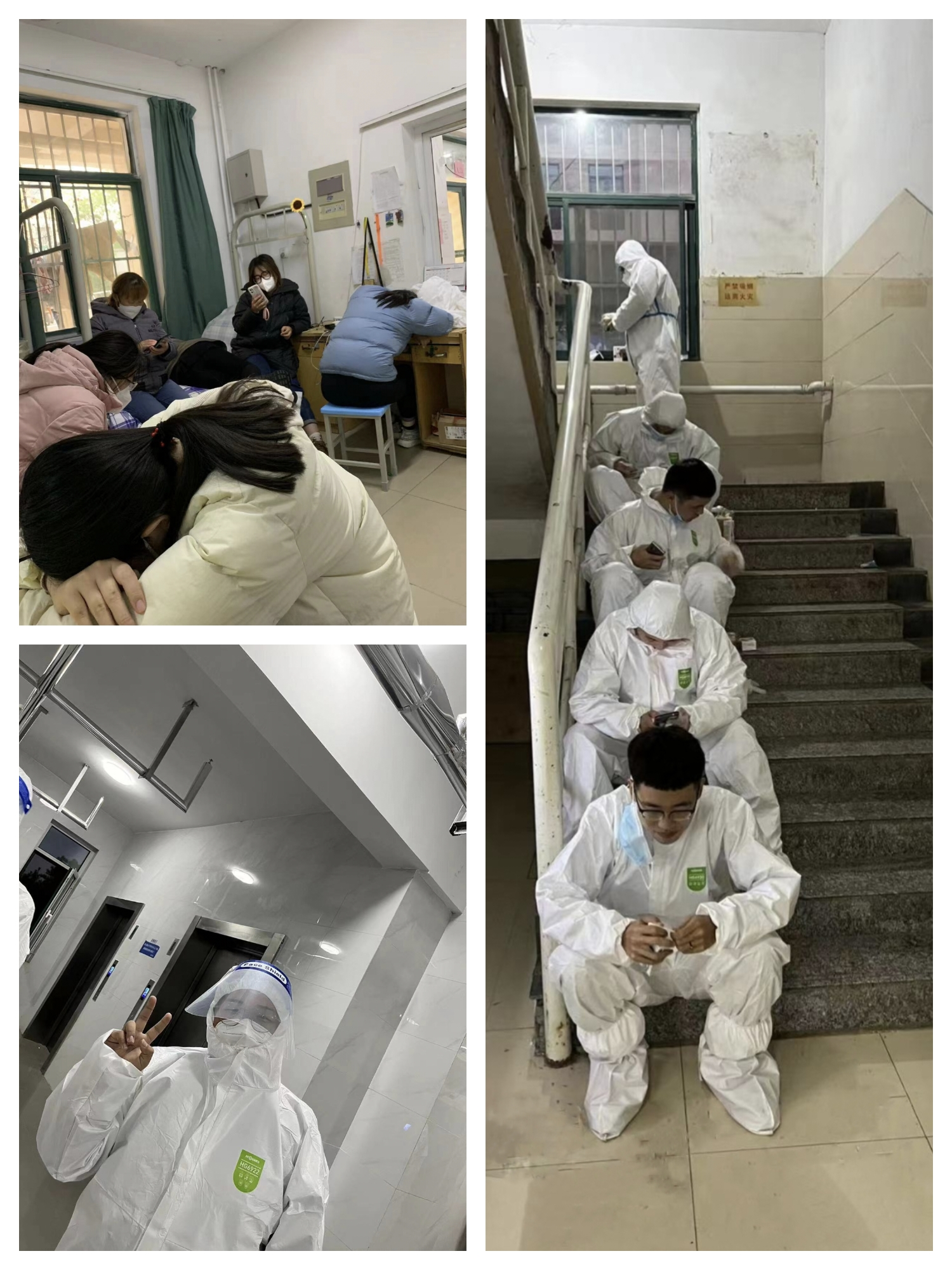 老师跟志愿者忙碌过后的疲惫,趴在桌子上休息、在楼梯上吃饭。