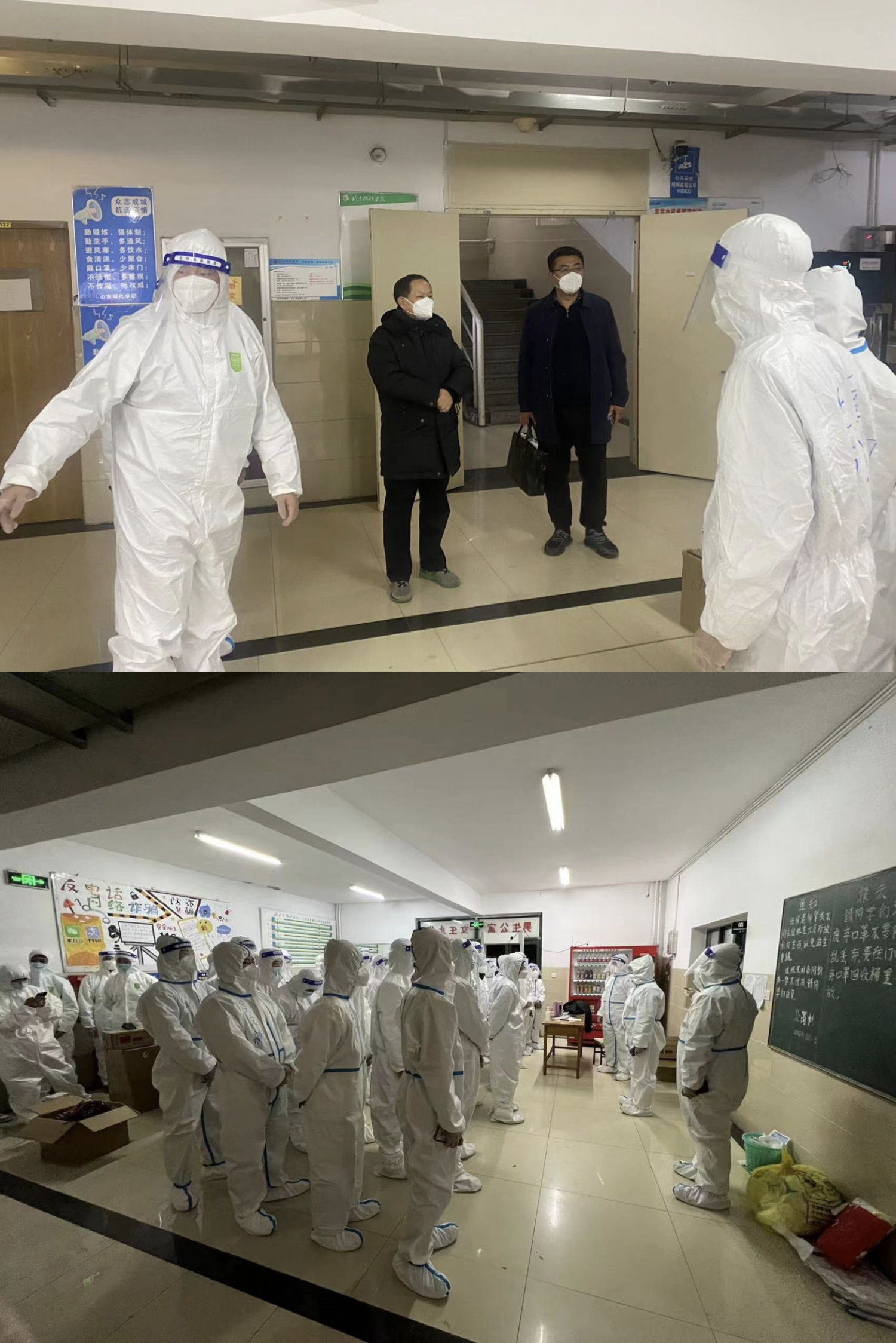 在工作人员发出“有疫情”信号后,全员进入静态管理状态。赵友春书记与仲光强院助前来视察前线工作。“大白”们行走在抗疫的第一线,将师生们的后勤保障工作落实到位。