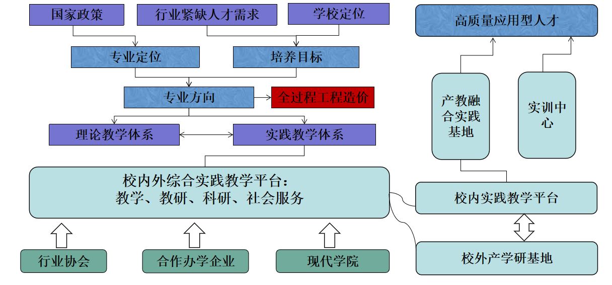 培养模式:工程造价专业紧贴国家政策,主动适应区域经济发展和行业需求,确立了全过程工程造价专业方向,结合校内实践教学平台和校外产学研基地,建立了“校-企-协”协同育人的生态化人才培养模式,形成覆盖建筑、安装、市政等工程的全过程造价管理专业特色,成为学院的一大亮点。