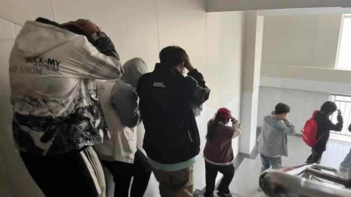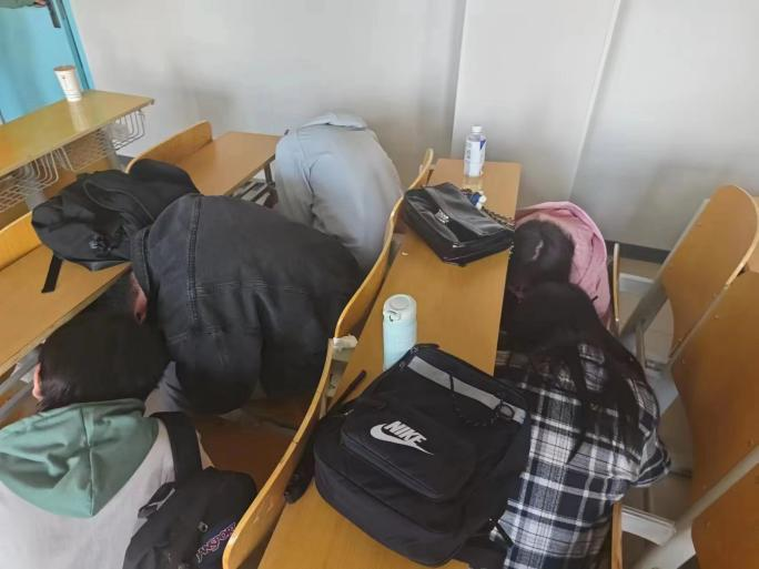 地震警报铃声响起,教室同学立即进行室内演练,用书包护住头部或双手护头蹲在桌下,以减少对头部的冲击与伤害。地震警报解除后,学生按照预案规划的疏散路线迅速有序撤离到教室外的安全空旷地带。本次活动用时5分30秒,应撤退1125人,实撤退1125人,此次活动圆满结束。
