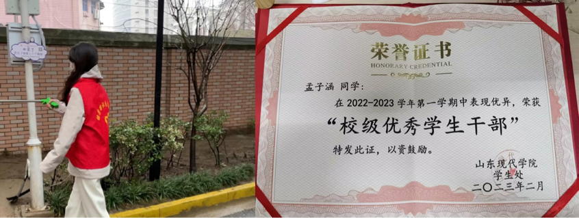 个人简介:孟子涵,女,汉族,共青团员,2021级本科交通运输班。在班里担任学习委员一职,严格遵守学院的各项规章制度,学习勤奋,自觉性强,积极参加各项活动,在思想、学习、生活、个人实践等方面都取得了较大的进步,受到老师和领导的一致好评,荣获“校级优秀学生干部”称号。