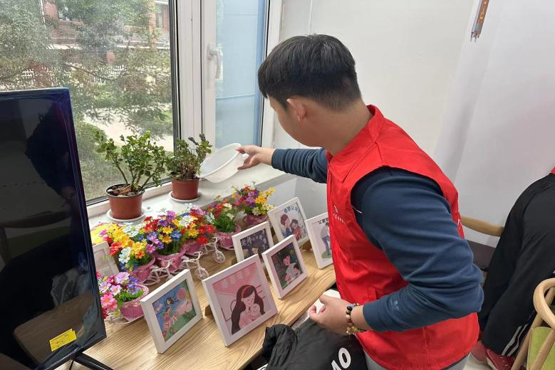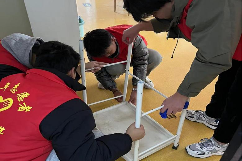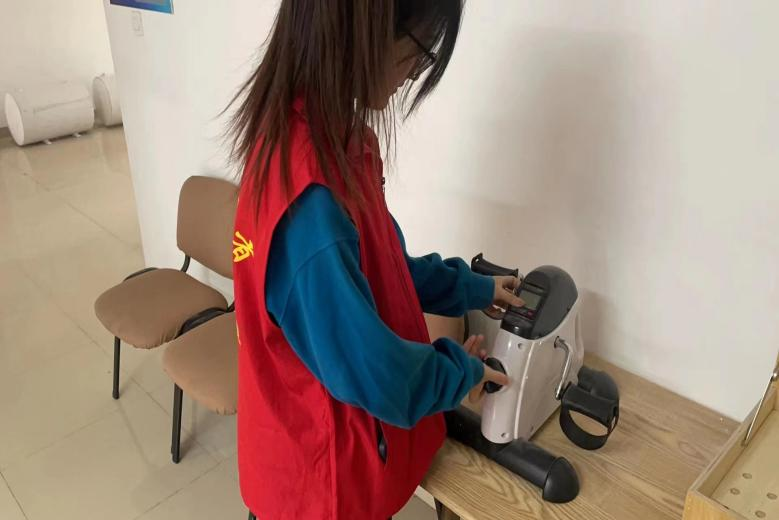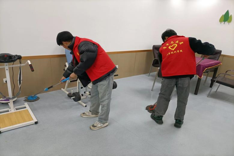 第三组成员走进翡翠雅郡日间照料中心,在与负责人交谈过后主动承担起整理设施的任务。志愿者们先是查看每个设施的工作状态及效率,之后按照各自功能摆放整齐,让老人们的生活更加方便快捷。