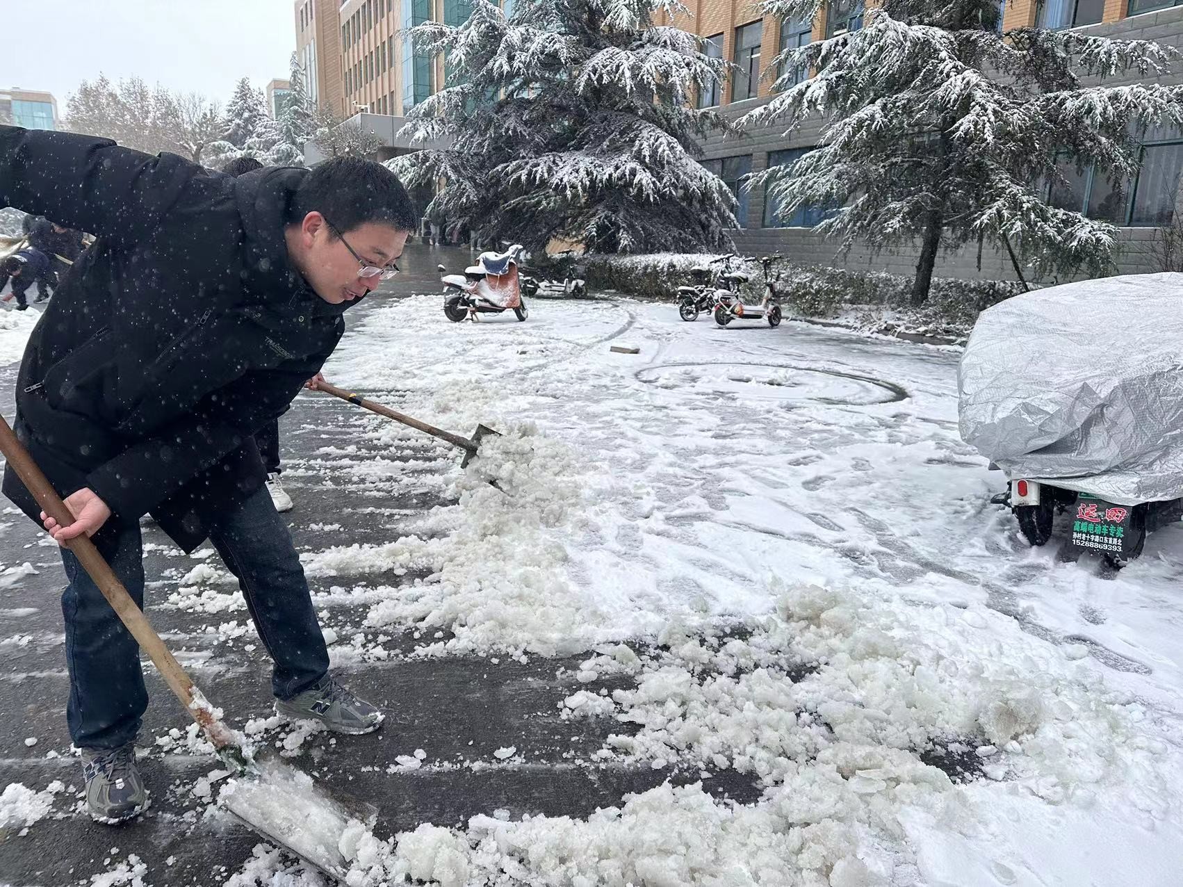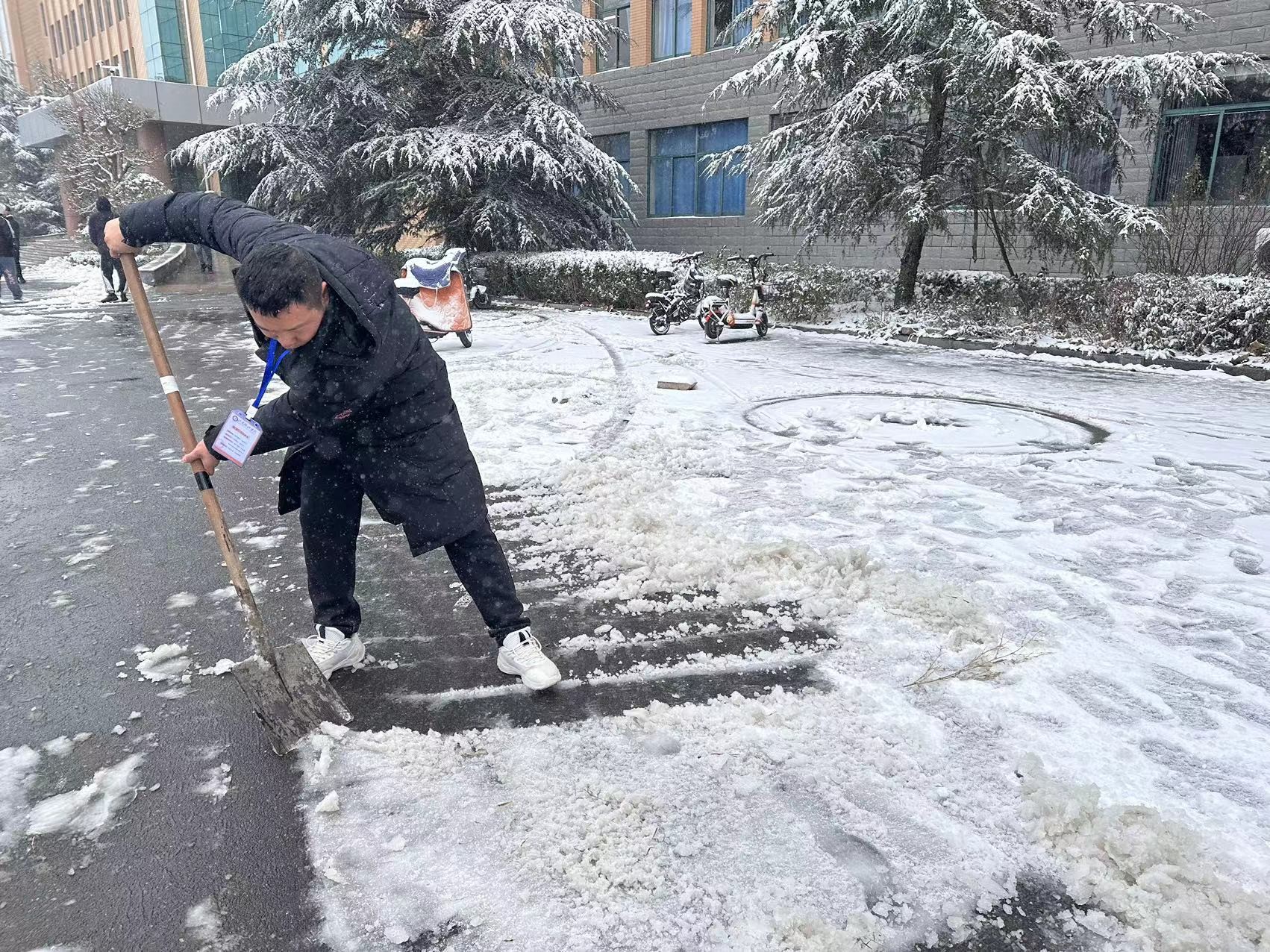 在清雪现场,工学院学管就业副院长阚保强和老师们起表率作用,他们拿着铁锹、铲子等工具,带领志愿者们一起铲除积雪。领导和老师们一边清雪,一边还不忘叮嘱学生们注意安全,他们以身作则,用实际行动为学生们树立了榜样。