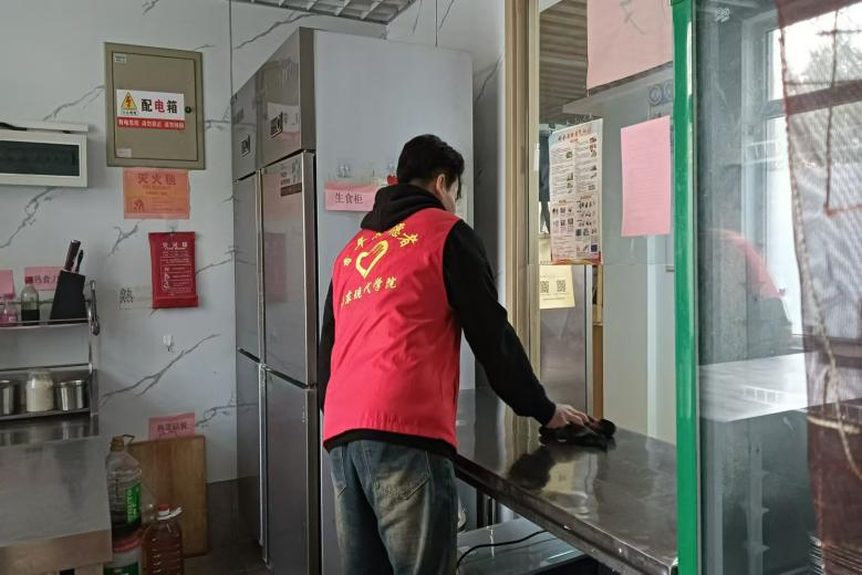 在社区厨房区域,志愿者们同样忙碌不已。他们戴上手套,拿起抹布,对厨房的灶台、餐具、桌椅等进行了全面而深入的清洁打扫,每一个环节都一丝不苟。他们的服务精神为社区居民的饮食环境提供了良好保障。