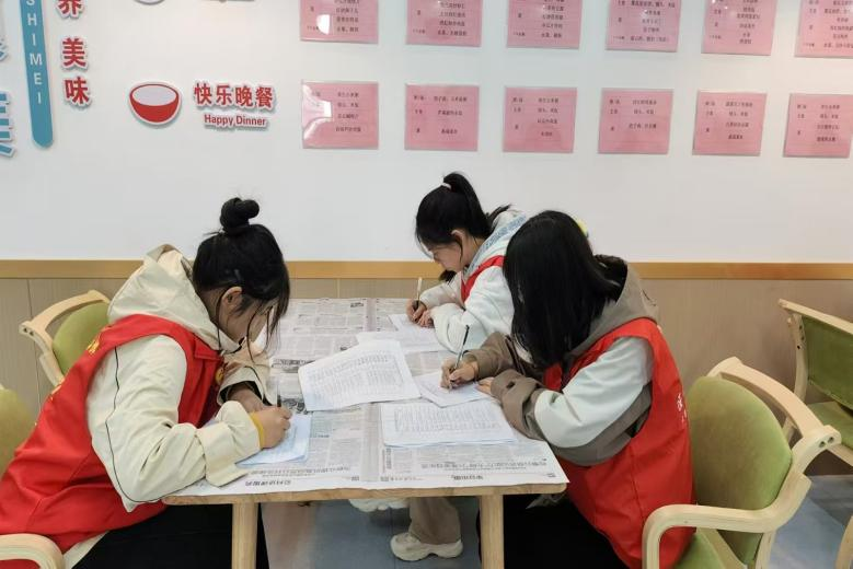 与此同时,部分志愿者走进社区办公室,协助工作人员进行材料抄写与整理工作。他们仔细抄写着各类文件材料,确保字迹工整、内容准确。