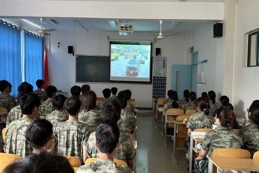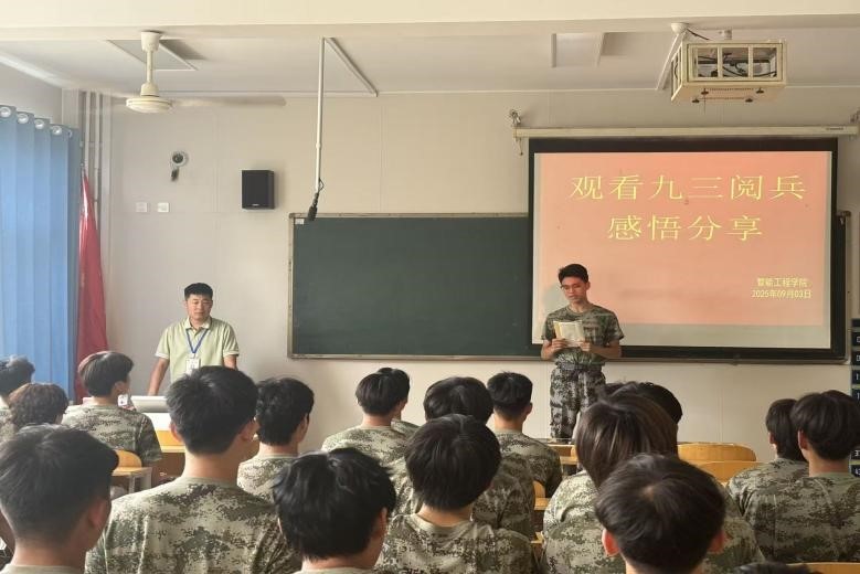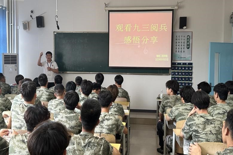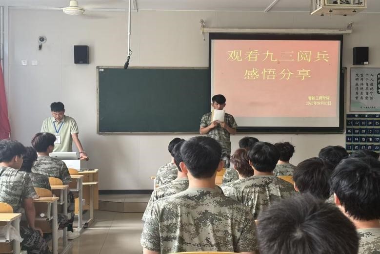 在随后的分享会上,2025级工程造价一班的王一凯同学率先发言:“看到装备方队中那些融合前沿科技的武器亮相时,我倍感振奋。作为新时代的大学生,我深知科技是国防的基石。未来我会更专注于专业知识学习,以实际行动为祖国科技发展添砖加瓦。”